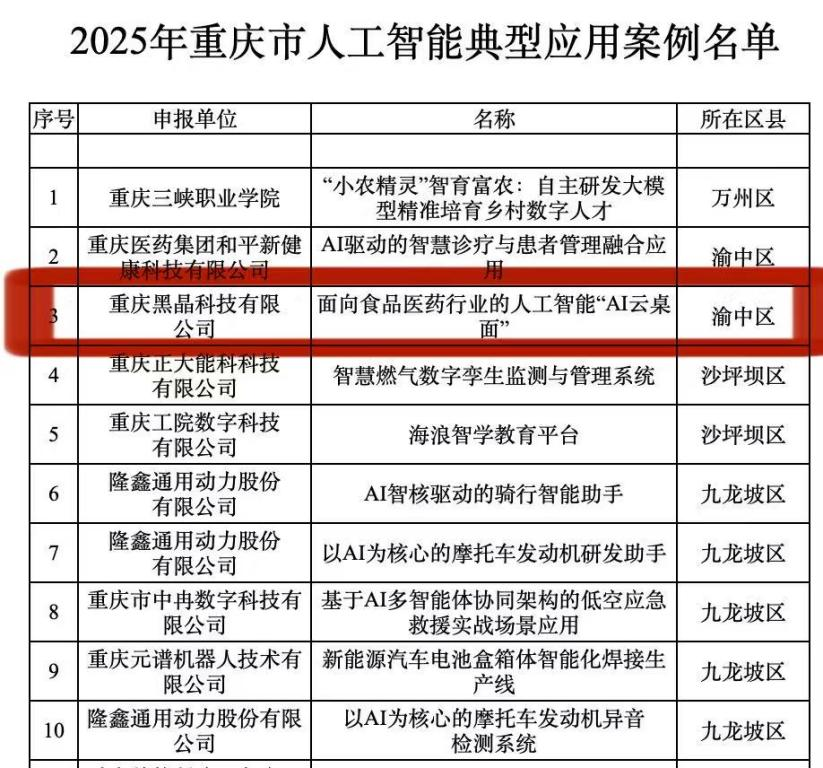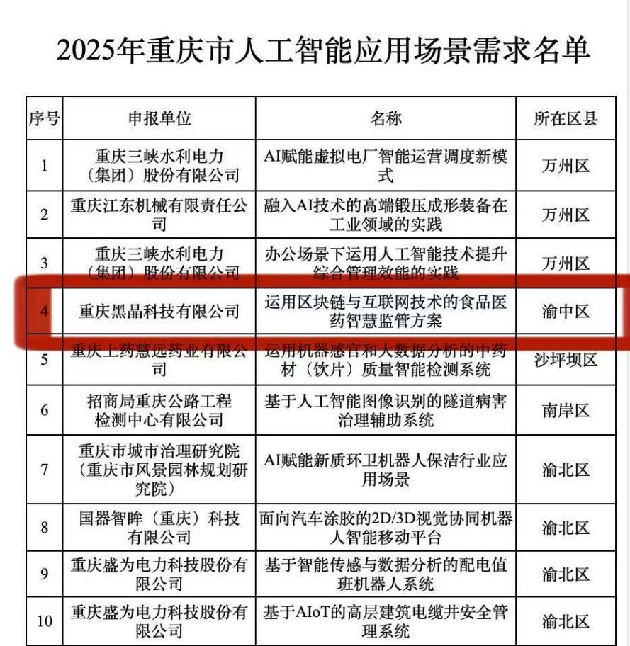 近日,重庆市经济信息委公布2025年重庆市人工智能典型应用案例和应用场景需求名单,重庆黑晶科技有限公司的“面向食品医药行业的人工智能‘AI云桌面’”和“运用区块链与互联网技术的食品医药智慧监管方案”入选人工智能应用场景需求名单。标志着黑晶在人工智能领域的技术实力与实践能力获得权威认可。